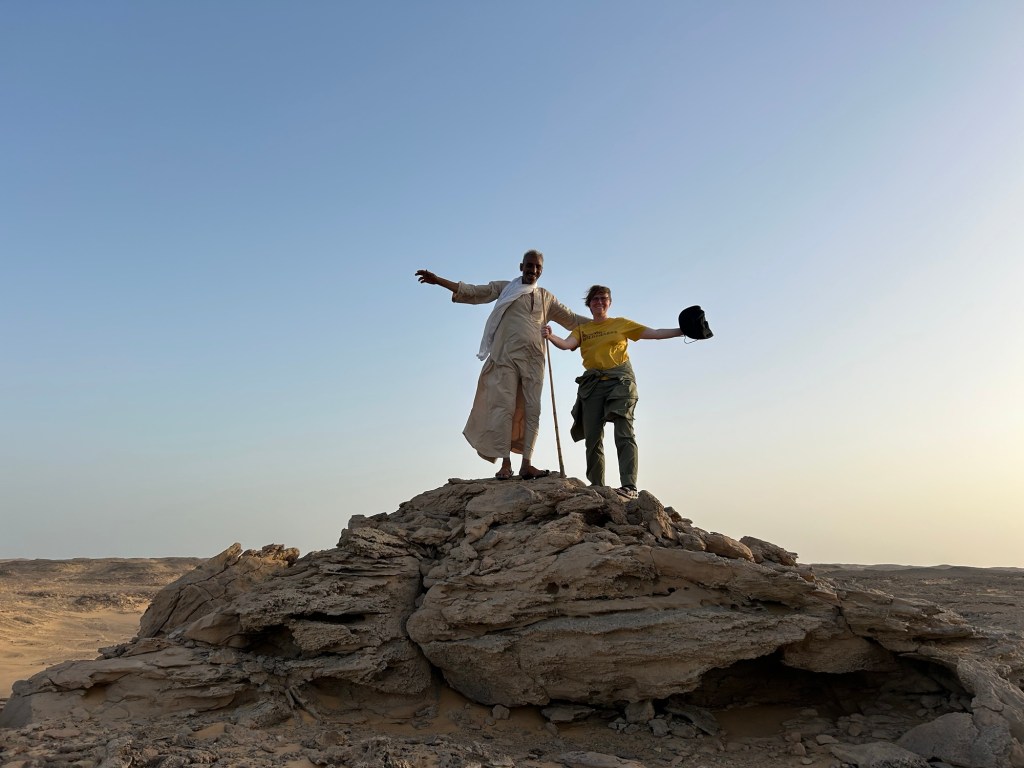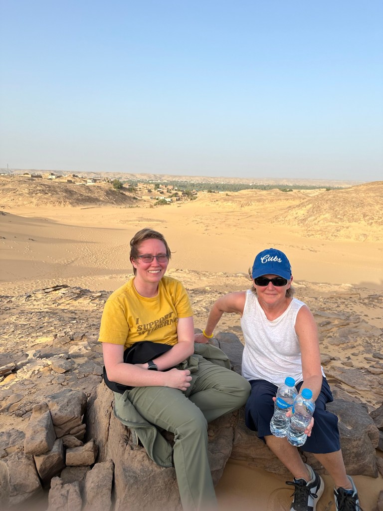 Let’s address the afternoon walk. If the Nile swimming constitutes lunacy, this activity was, not not well thought out by yours truly. It was described as a walk in the desert, but it turned out to be more of Lawrence of Arabia type trek. Jump on the tug to head north about a mile; Jump off to the side and walk through a village; enter the desert straight into the 5 pm setting sun; trek across a wide desert area to a rocky outcropping with “some shade”. Jim and Frances wisely declined, but Mary and I jumped aboard.